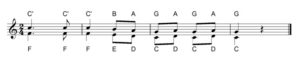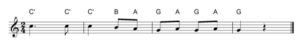 This is a semitone higher than the version you have just heard. It uses only white notes and can be played on a single octave C-C glockenspiel or chime bar set.