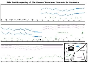 Listen to the opening of the second movement of Concerto for Orchestra – titled ‘Giuoco delle Coppie’ or ‘Game of Pairs’ – showing the graphic score on a whiteboard. The score covers bars 1-45, approximately 1 minute of music (our playlist only has 30 seconds so you should find a longer recording to make the most of this activity). As you discuss the music, you should listen to it several times.