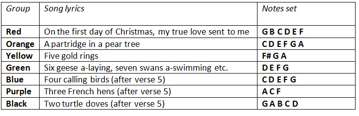 - Twelve Days group colour cards (version for Bb instruments also available) – printed out on separate sheets of paper, one per group (available to download below)
